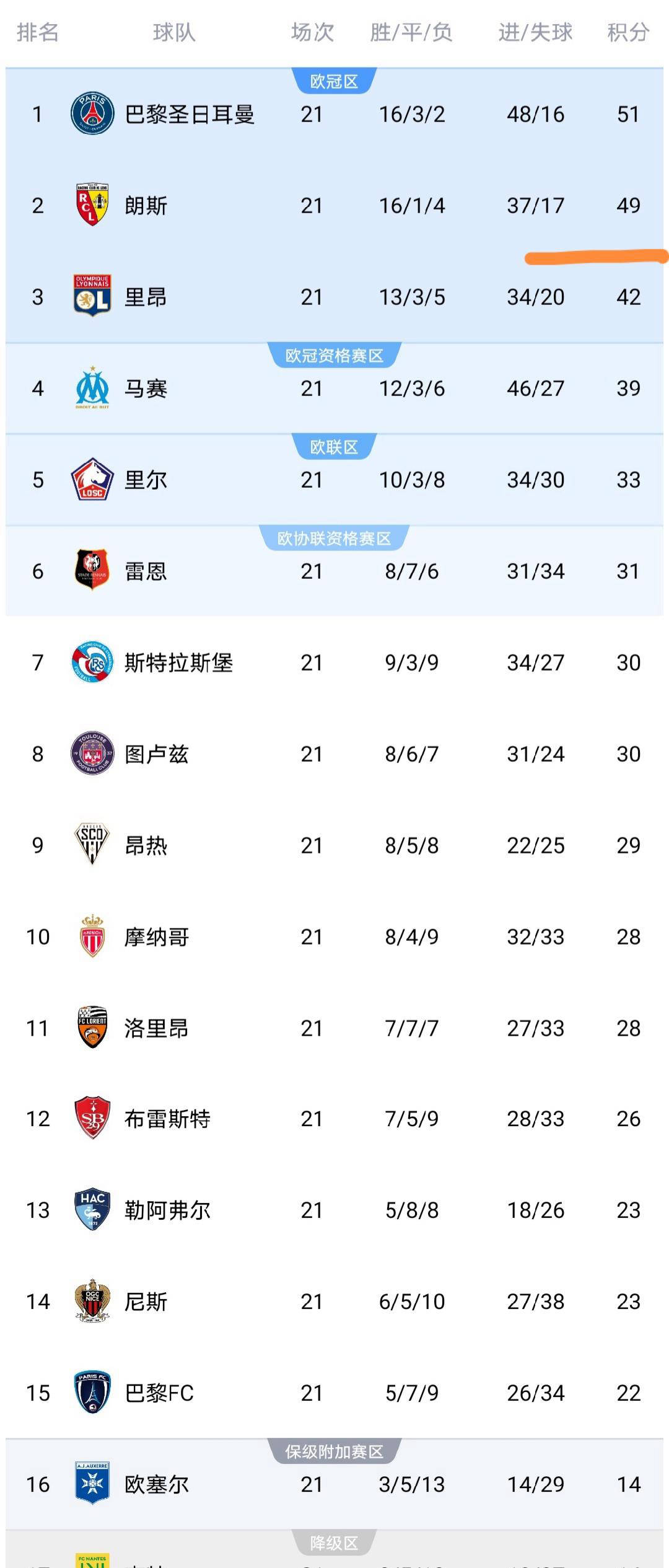 场大胜依据这,积分上升至51分巴黎圣日耳曼的,越朗斯再次超,法甲积分榜从新登顶。反相,因惨败马赛队,持正在39分其积分保,昂仅有3分之差但隔绝第三名里,冠正赛资历的机缘已经保有篡夺欧法甲最新积分榜揭秘:马。然本轮战平摩纳哥虽,升至28分但积分提,第十稳居,雷恩唯有3分差异隔绝排名第六的。后积分升至23分而尼斯成绩1分,降级区9分当前当先,安闲缓冲有必定。斯特拉斯堡后勒阿弗尔打败,至23分积分也增,第十三排名,所好转式样有。